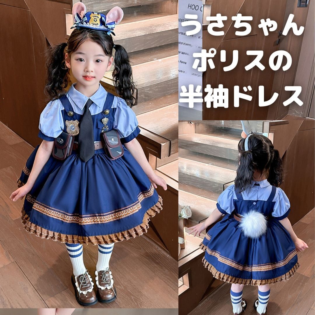 ハロウィン コスプレ女の子ドレス子供キッズ半袖うさぎポリス警察官ロリータ ワンピース100 110 120 130 140 150 コスチューム衣装ズートピアのジュディ・ホップス風ブルー青かわいい警察